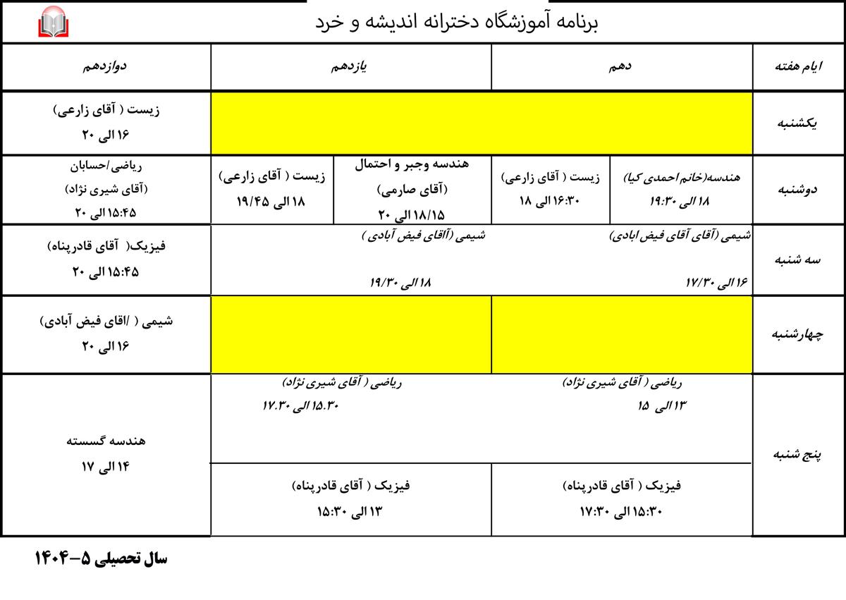 برنامه هفتگی اموزشگاه اندیشه و خرد ۱۴۰۵-۱۴۰۴
